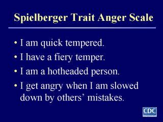 Anger Scale Spielberger CD, Reheiser EC, Sydeman SJ. Measuring the experience, expression, and control of anger. In: H. Kassinove, ed. Anger disorders: definitions, diagnosis, and treatment. Washington, DC: Taylor & Francis; 1995:49-67. |