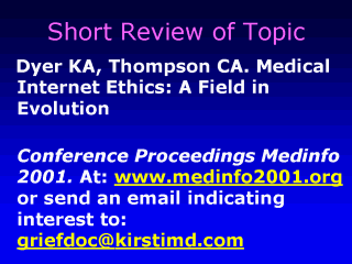 that will require further study. The original paper written in December 2000 can be obtained via the conference proceedings available at Medinfo 2001, or by e-mailing me at griefdoc@kirstimd.com. |