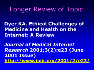 interested. It is likely at the end of this presentation, you may be left with more questions than answers, but this would be expected when looking at the ethical challenges facing medicine and health on the Internet. |