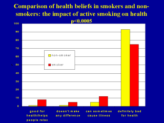 | We also found significant differences in the health beliefs of smokers and non-smokers about the impact of both active and passive smoking with non-smokers more likely to believe that smoking was bad for health. |