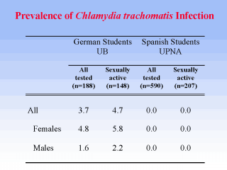 chlamydia trachomatis infection among German and Spanish students by gender. As you see at first glance we found no cases of chlamydia infection among Spanish students either in the whole sample nor in those reporting having ever had sexual intercourse. A different picture arises if we look at the prevalence rates in the German sample. Among all students tested we found a rate of infection of 3.7%. The chlamydia prevalence was considerably higher in females with 4.8% than in males with 1.6%. If we focus on those reporting ever had sexual intercourse the overall prevalence was 4.7% with 5.8% in females and 2.2% in males. |