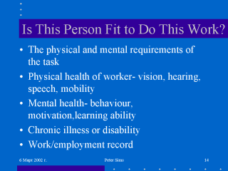 company pension scheme. It is increasingly about trying to fit the person into the workplace and to minimise the health hazards to him. It is also about protecting his fellow worker and indirectly the public who may purchase and use the product. Pre-employment screening can be used positively, to discriminate and to find employment safely for disabled men and women. |