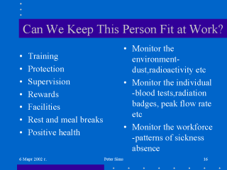 and maximising safety. The workplace environment and the workforce will need to be monitored. There is a requirement to maintain comprehensive records on 1. The workplace environment 2. Individual worker sickness, accidents and absenteeism 3. Results of monitoring the worker There is an obligation upon the employee to comply with safety regulations, to attend for training and to use appropriate protection. |