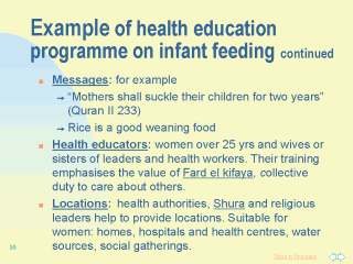 reading Ministry of Public Health/ACBAR/Water & Sanitation Sector Group, Hygiene Education Policy Guidelines for Afghanistan, UNICEF Afghanistan 2001 WHO publications on infant feeding: http://www.who.int/child-adolescent-health/publications/pubnutrition.htm |