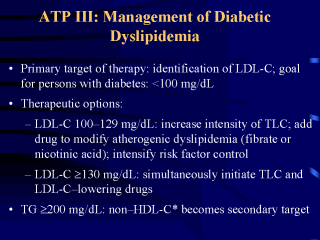 dyslipidemia is essentially atherogenic dyslipidemia in persons with type 2 diabetes. *Non–HDL-C goal is set at 30 mg/dL higher than LDL-C goal. Expert Panel on Detection, Evaluation, and Treatment of High Blood Cholesterol in Adults. JAMA. 2001;285:2486-2497. © 2001, Professional Postgraduate Services® |