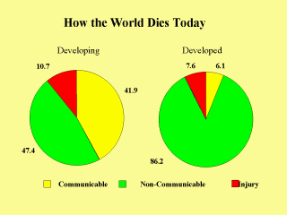 non-communicable disease than from communicable disease. In Latin America and the Caribbean, for example, there are almost twice as many deaths from non-communicable diseases as communicable disease. In China, there are 4 ½ times as many deaths from non-communicable diseases. Only in India and Sub-Saharan Africa do communicable diseases still dominate, accounting for 51 % and 65 % of deaths respectively. The Global Burden of Disease (Data are for 1990) |