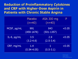 significantly reduced with aspirin at 6 weeks. This study also compared M-CSF, IL-6, CRP,