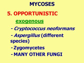 | Some of many other opportunistic fungi are: Penicillium marneffei, Fusarium, Bipolaris, Exophiala, Scedosporium, Sporothrix, Pseudallescheria. True pathogenic (endemic) fungi cause more severe infections in compromised host than in otherwise healthy people. If a patient, undergoing therapy which will compromise him/her, was exposed, he/she has to take fluconazole for the reactivation prevention. |