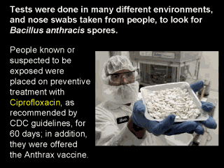 | A technician holds a tray of newly-made anthrax medication ciprofloxacin tablets at pharmaceutical company Apotex Inc. in Toronto, Thursday, Oct. 18, 2001. Drug maker Apotex has been asked by Health Canada to make one million tablets of ciprofloxacin. The drug, known as Cipro, is used to treat anthrax. (AP Photo/CP, Kevin Frayer) |