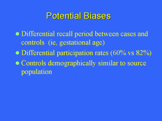 women were recalling exposures further in the past than case women - Although the case-control difference in recall time was only about 1 month, the shorter recall time for case women may have caused them to remember exposures somewhat more accurately than control women - Combined with the possibility that women with affected pregnancies would recall exposures more carefully, this differential exposure misclassification also would have attenuated observed protective folate effects - If selection bias produced the weak or null folate effect, then control women with higher socioeconomic status (better diets and more vitamin use) must have refused participation more often - However, we know from vital statistics data that control women in the study were remarkably similar to the entire border population |