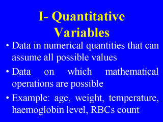 | Data for a quantitative variable are numbers that can take any possible value along a continuum and hence called continuous. Also, mathematical operations can be performed on a continuous variable and give meaningful results. |