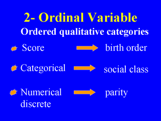 | For an ordinal variable, the possible responses have natural order or progression. If scores are assigned to rank individuals, the ordinal variable is score ranking. If the ranking occurs for group of responses, the ordinal variable is categorical. The most confusing type of ordinal variables is the numerical discrete, where a number is assigned but does not mean a true quantity. |