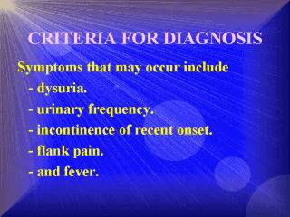 | Catheter-associated urinary tract infections are generally assumed to be benign. Such infection in otherwise healthy patients is often asymptomatic and is likely to resolve spontaneously with the removal of the catheter. Symptoms that may occur include dysuria, urinary frequency, incontinence of recent onset, flank pain, and fever. Confusion and delirium are often attributed to UTI, although without high fever or sepsis. |
