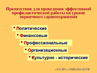 законодательная и нормативная основа. Финансовые препятствия - отсутствие знаний об экономических последствиях проведения/не проведения профилактических мероприятий. Отсутствие финансовых стимулов для врачей и медсестер заниматься профилактикой заболеваний и укреплением здоровья. Профессиональные - врачи, в целом, обучены лечить болезни, а не предупреждать их развитие и укреплять здоровье пациента; не удовлетворены небольшими положительными изменениями в уровнях факторов риска у пациентов; не осознают выгод, которые приносит укрепление здоровья населения; медицинские сестры мало привлечены к профилактической работе; не получают должной поддержки и поощрения в том, чтобы работать самостоятельно. Организационные - отсутствует четкое разграничение функциональных и должностных обязанностей в области укрепления здоровья и профилактики заболеваний между федеральными, региональными и муниципальными структурами; недостаточно знаний и навыков по организации работы с населением за пределами поликлиник; недостаточное участие центров медицинской профилактики в укреплении здоровья и профилактики заболеваний на популяционном уровне. Культурно-исторические - мало инициативы снизу, ожидание указаний сверху, синдром начальника - «начальник всегда прав». |