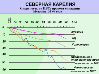 снизилась смертность от ИБС на 60%. Примерно также снизилась смертность среди женщин. Также наблюдалось существенное снижение смертности от рака среди населения обоих полов, особенно – смертности от рака легких. |