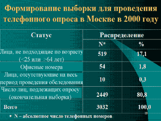 т.д. Изучение поведенческих факторов риска методом телефонного интервью в 2000-2001 гг. в Москве показало, что при изначальной выборке в 3032 человека после исключения из нее лиц, относящихся к ошибке выборке, осталось 2449 человек. Из них было опрошено 1693 человека. |