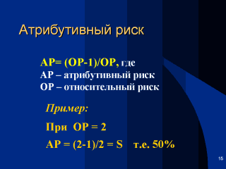 Например, при относительном риске равном 2 (риск удваивается при воздействии фактора) атрибутивный риск равен S или 50%. Это значит, что половина случаев заболеваний (смертей) связана с воздействием этого фактора риска.