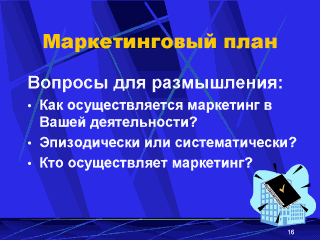 | При обдумывании этих вопросов ответ скорее всего будет содержать больше ответов. Вряд ли маркетинг проводится систематически. Скорее всего он носит спорадический характер. Лиц, ответственных за маркетинг практически нет. Планов проведения маркетинга также в программах практически не существует. |