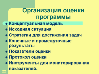 внедрения проекта, Определить ресурсы, исходную ситуацию, нужды, Определить стратегии и процессы для достижения задач проекта, Определить конечные и промежуточные результаты проекта, подобрать показатели оценки, Подготовить протокол оценки с указанием сроков ее проведения, Подготовить инструменты (опросники, карты, таблицы) для мониторирования показателей. |