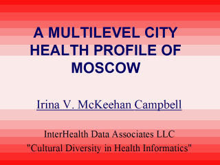 Moscow, examining individual and urban level factors. "Inequity and Inequality in a Healthy City Profile of Moscow” Part I and Part II Full text published as McKeehan, I.V. “A Multilevel City Health Profile of Moscow”, Social Science and Medicine, n. 9, vol. 51 (November, 2000): 1295-1312 |