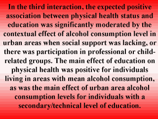 | In low consumption areas, individual education was inversely related to physical health, while in high consumption areas, education was positively related to physical health. Higher education for people living in areas with greater inequality and alcohol consumption had a protective effect on their physical health, as did residing in more egalitarian areas with lower alcohol consumption for those with lower educational status. |