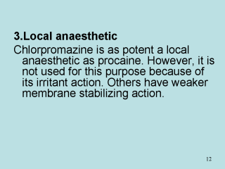 system Neuroleptics produce hypotension (primarily postural) by a central as well as peripheral action on sympathetic tone, which is more marked after parenteral administration and roughly parallels the á-adrenergic blocking potency. This is not prominent in psychotic patients and is accentuated by hypovolemia. Partial tolerance develops after chronic use. Reflex tachicardia accompanies hypotension. High doses of chlorpromazine directly depress the heart and produce ECG changes – QT prolongation and suppression of T wave. It exerts some antiarrhythmic action, probably due to membrane stabilization. Arrhythmia may occur in overdose, especially with thioridazine. |