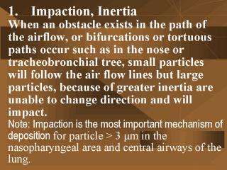 | Click for the picture The impaction parameter ( I) is as follows:I = ( D2 x Cc x Dp x V ) : (18n x Do) CC = Cunningham correction factor DP = Density of particle D = Diameter of particle (great importance since D2 in formula) V = Air Velocity n = Coefficient of Viscosity of Air Do = Diameter of object through which particle is moving |