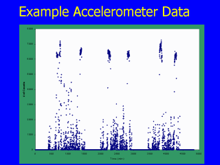 minute-by-minute accelerometer data for an individual. - The activity counts are zero when the subject is sleeping or inactive. - This particular subject was active indicated by their twice daily bouts of high activity counts. |