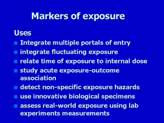 the skin absorption rate.. ) while markers account for all these routes. 2. Ambient exposure typically fluctuate over time. So short-term fluctuation in dose measures at a single time will increase inter individual variability, markers that integrate dose overtime will reduce such variability and thereby reducing exposure misclassification. Or serial sampling could also reduce the variability. 3. Biomarkers sometime allow a series of dose estimates for different time points, eg hair.. it will give a wider time window of exposure. 4. Are useful for short term prospective studies or cross-sectional studies to study the recent precipitating factors of an illness, example an asthma attack, or a myocardial infarction. 5. Nonspecific markers for more than one chemical can also be useful, so in case of certain chromosomal abnormality, this will give an indication of total genetic damage from several different exposures, eg hazards from a certain job that involves several industrial processes. 6. Innovative specimens like biopsies and surgical specimens. 7. It combines the accuracy of laboratory experiments with real populations rather than animals and than the problems of extrapolation and dose calculation |