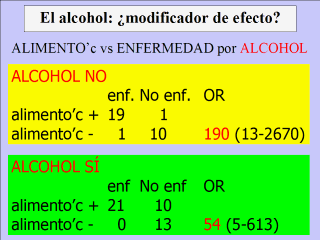 enfermedad, estratificado por consumo de alcohol. En esta y la siguiente diapositiva, se ha utilizado la "odds ratio" (OR) por razón de disponibilidad de programa capaz de calcular esta medida con cero efectivos en los estratos (Two by Two table Analysis, por J. Keightley and R. Centor). Vemos que el riesgo es mayor en el grupo que no consume alcohol. En ambos, los alimentos contaminados están asociados fuertemente con la enfermedad. |