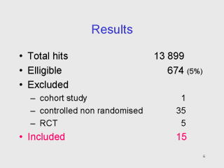 | ******** Cohort : Hazinski 1995 - Dueker 1975 - compared 3 education methods - no control - McKelvey 1978 - compared 2 education methods - no control - Kelly 1987 - no pedestrian education - Stuy 1993 - no pedestrian education - Cross 2000 - only 3 clusters for randomisation - Studies in which there were less than five randomised clusters were excluded because of the interpretational difficulties caused by the total confounding of two sources of variation: the variation in response due to the effect of intervention, and natural variation that exists between the clusters even in the absence of an intervention effect. Measuring and adjusting for baseline differences can help reduce such confounding, but the inherent problem that such trials can only be analysed at the level of the individual remains. To analyse at the individual level, one would have to assume that there is no clustering of individual responses within the community, which is almost always untenable (Donner 2000). |