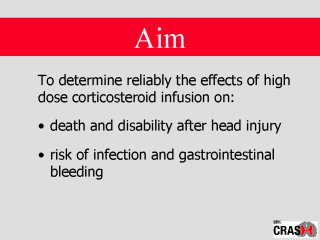 reliably: - the effects of a high dose corticosteroid infusion on death and disability following head injury and - the effects of such an infusion on the risk of infection and gastro-intestinal bleeding in this setting |