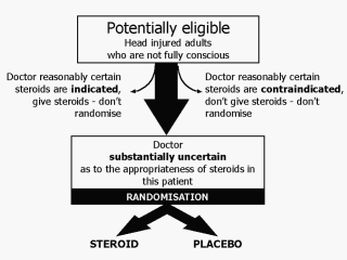 eligible for CRASH? - All head injured adults who are not fully conscious (GCS 14 or less), who are within 8-hours of injury - The fundamental eligibility criterion is the responsible doctor’s “- uncertainty” whether or not to treat with corticosteroids - If the doctor is reasonably certain that there is a clear indication for corticosteroids (such as patients who also have an acute spinal cord injury) then the patient should not be randomised - Likewise, if the doctor is reasonably certain that there is a clear contraindication to corticosteroids then the patient should not be randomised - All patients for whom the responsible doctor is substantially uncertain whether or not to give corticosteroids are eligible for randomisation |
