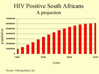 future course of the epidemic. The above graph represents the Scenario 325 model created by Metropolitan Life. In 2001 it was estimated that 4.7 million South Africans (2.5 million women and 2.2 million men) were infected with HIV. It is projected that these figures will rise to 6 million by the year 2010. The implications and impact of such infection rates are serious, and will be felt at all levels and in all sectors. More information on the Metropolitan Life models can be obtained from their website: www.redribbon.co.za |