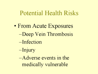 myocardial infarctions (thought to be brought on by the environment of the airliner). There recently has been some concern over the transmission of tuberculosis from an infected passenger to others on the airplane, or the spread of tuberculosis from endemic areas due to the increased availability of air travel throughout the world. Case reports of infectious individuals traveling on planes and exposing passengers to TB are published. A recent review, though, suggests that transmission to other passengers is not always certain, and no case of active TB has been thought to result from exposure while in air travel. See: WHO, Tuberculosis and Air Travel: Guidelines for Prevention and Control. (At WEB) |