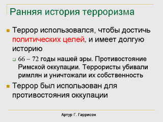Во многих случаях террор был оружием групп, которые хотели быть услышанными, добиться политических перемен, но не чувствовали, что они могли это сделать. Они видели терроризм как способ быть услышанными. Arthur H. Garrison, How the World Changed: a History of the Development of Terrorism, presented at Delaware criminal Justice Council Annual Retreat, Oct 28-29, 2001 |