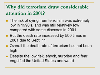 | The risk of dying from terrorism was even lower than that from hitting by lightening. Assume how surprised you will be, if someone tell you that your chance of hitting by lightening will be as high as that of homicide. |