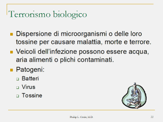 | Da: Phillip L. Coule: Chemical and Biological Terrorism, an overview of the threat. (Terrorismo chimico e biologico, uno sguardo sulla minaccia) |