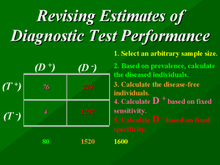 | - Back Calculation Method: “A physician wishes to assess the predictive ability of a clinical test in a population in which the prevalence of breast cancer is 5%. Test sensitivity and specificity are unchanged; that is, they equal .95 and .85, respectively”. Step 1. Select an arbitrary sample size, for example 1600. Step 2. Based on a prevalence P (D+), of 5%, calculate the number of diseased individuals: 1600 x .05 = 80Step 3. Calculate the number of disease-free individuals: 1600 - 80 = 1520 Step 4. Calculate the proportion of diseased individuals with a positive test, based on a sensitivity of .95: .95 x 80 = 76 . . . . then 80 - 76 = 4 Step 5. Calculate the proportion of disease-free individuals with a negative test, based on a specificity of .85: .85 x 1520 = 1292 . . . . Then 1520 - 1292 = 228 |