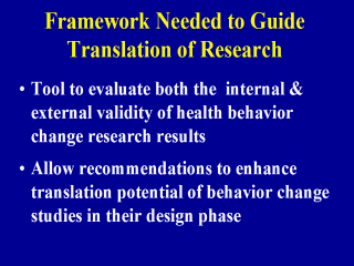 | An evaluation framework to design studies and assess their generalizability would be useful. Something similar to CONSORT but specifically to judge the translatability and potential effectiveness in public health applications. |