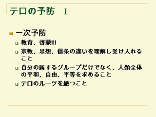 疾病予防対策は、臨床治験や他の疫学データに基づいて立案される。テロに関して、偏りのないデータを収集することは困難であり、従って、疾病予防と似た形で対策を立案することは、非常に困難であるが、その限界をわきまえた上で、ここで、疫学、公衆衛生の観点かとらえた、テロの予防対策を論じてみる。