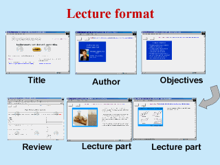 lecture format: Each lecture has cover page with its title and objectives. There is author’s biography and then about 30 slides of lecture body. There is usually a reference page. At the end of each lecture there is a review format. Lecture users, who are mainly university professors or graduate students, rate the lecture using the form. The comment is either corrected by Supercourse tean or transferred to the author for further revision. |