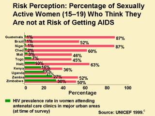 practices. The reasons people may think they are not at risk for HIV/AIDS include lack of knowledge about HIV infection, how it is transmitted and the level of risk in their area. However, it may also be because they do not know or believe that their behavior or their partner’s behavior places them at personal risk for becoming infected with HIV. This underscores the importance of wide reaching education to convey accurate information about HIV, to counter or dispel misperceptions and myths and most important to promote prevention. |