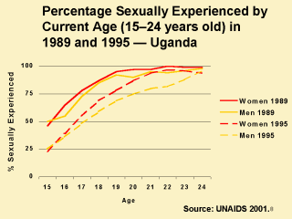 | In Uganda, the HIV epidemic was recognized relatively early and prevention efforts were started on a national level, including commitment and involvement of political, community and religious leaders; radio messages on HIV/AIDS; social marketing of condoms; and extensive availability of HIV voluntary counseling and testing. As shown in this figure, since 1989 there has been a delay in the first sexual experience of both young men and women. |