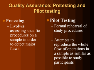 pilot testing often used synonymously but they aren’t. Pretesting can be done in two stages…1st on a convenience sample of your colleagues, friends; this is just to get an idea of the time it takes, the flow of the questions, etc. 2nd phase of pretesting would be the more formal where the procedure (usually the questionnaire) is administered on approximately 10% of your sample size in a sample as similar as possible to the study participants BUT NOT IN THE SAME AREA. Pilot testing is of all the processes including the questionnaire. |