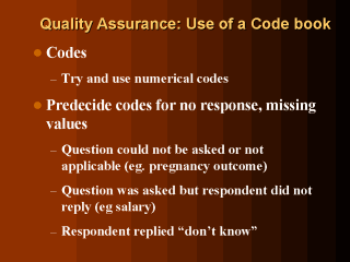 include your decision on how to record missing data. SPSS can define certain values as missing. Remember to be consistent with handling of missing information and its coding. Predecide on the codes to use for missing data, etc and keep consistent with the format. Eg. 9, 99, 999 for Don’t know 8, 98, 998 for Refusal / 7, 87, 997 for No response / Not applicable |