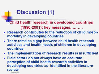 research is a fundamental tool for progress in child survival. However, there seems to be a gap between the on-going research activities and the health priorities of children in developing countries. It also appears that the translation of research results into action is unsuffiicent. The perception researchers have of health research gaps and needs may be sometimes inaccurate. |