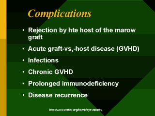 graft, acute GVHD, and infections. Later complications include chronic GVHD, prolonged