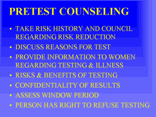 place in private setting - Provide information about HIV infxn and AIDS, the causative agent, & method of transmission |