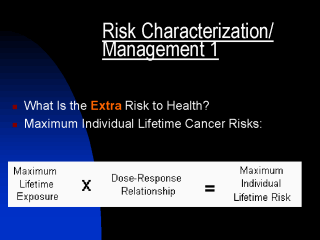 | Remember that this is called Risk MANAGEMENT by EPA but Risk CHARACTERIZATION by many others. Since management is a whole other ballgame, I prefer characterization: this is simply a mathematical modelling of risk. |